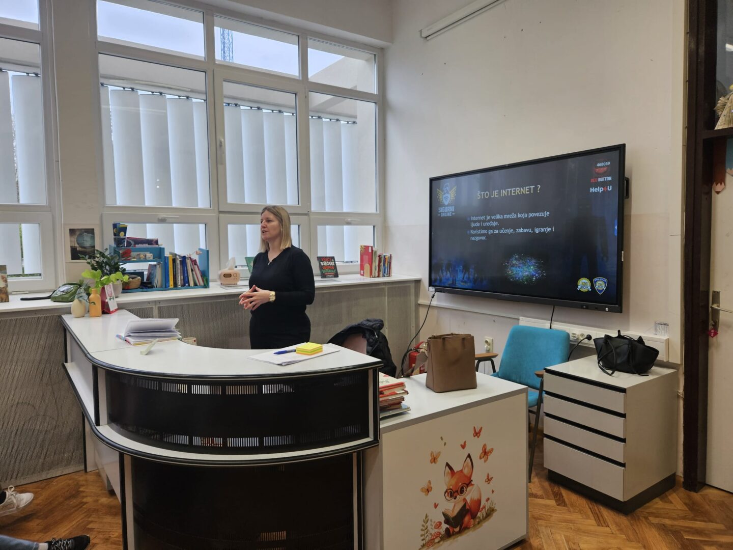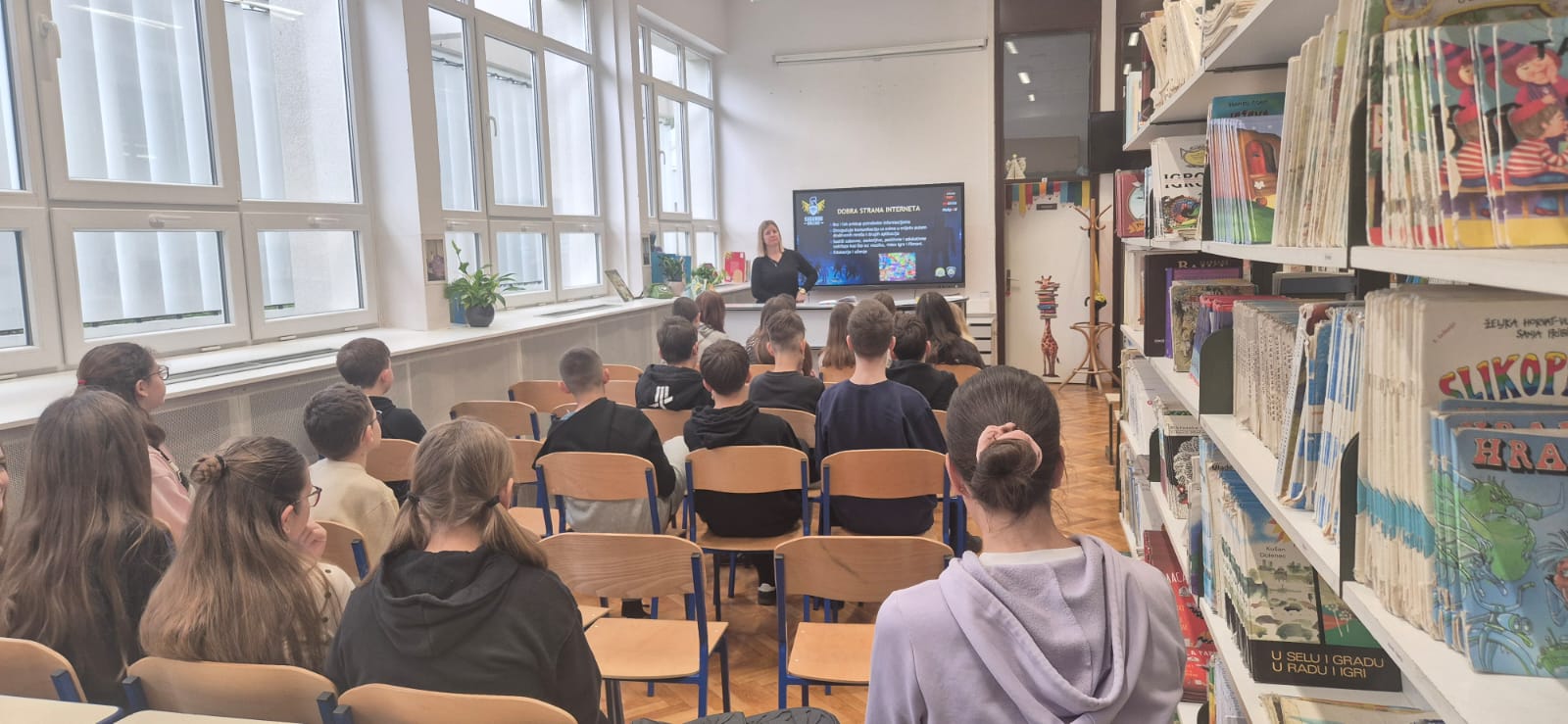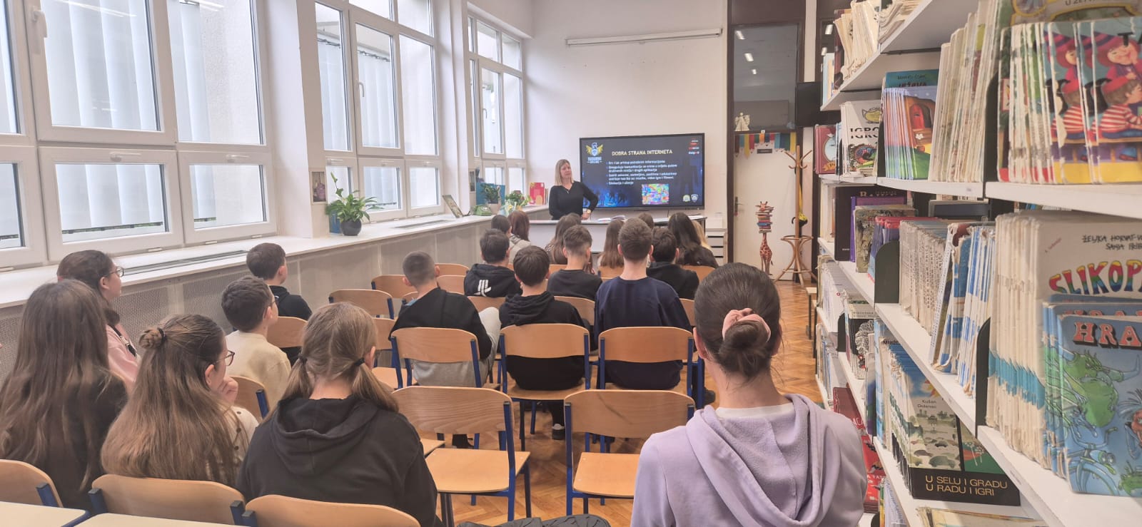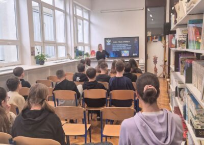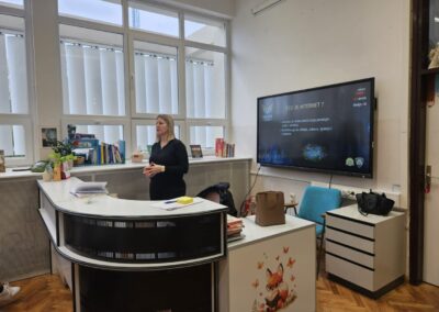 Službenica MUP-a upoznala je učenike s pravilima sigurnog i odgovornog ponašanja na internetu, mogućim opasnostima u digitalnom okruženju te načinima zaštite osobnih podataka i prepoznavanja neprimjerenih ili rizičnih situacija na društvenim mrežama. Učenici su imali priliku postavljati pitanja i kroz primjere iz svakodnevnog života naučiti kako odgovorno koristiti internet i digitalne tehnologije.